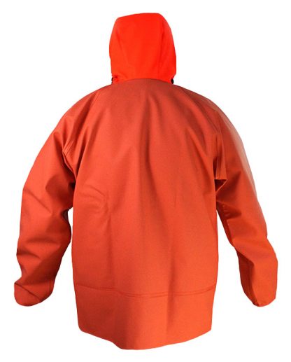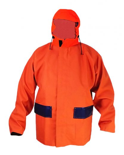 Chaqueta Beluga abierta color naranja, con cremallera de carro de plástico para evitar la oxidación. Recubierta con forro plástico para evitar la humedad del algodón del interior.